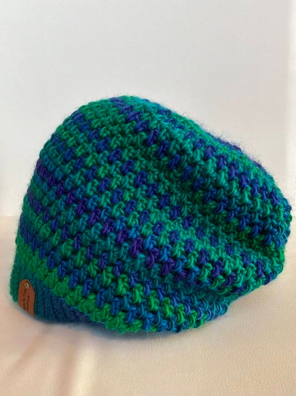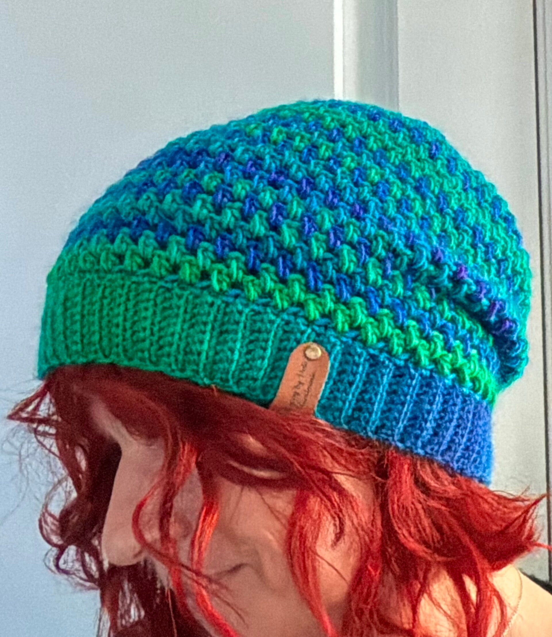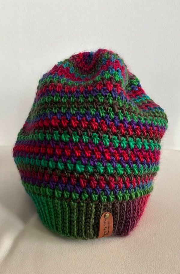 Puzzle : A beanie made of pure chaos energy. Reds, greens, blues, purples, and browns jumped in and said ‘me too